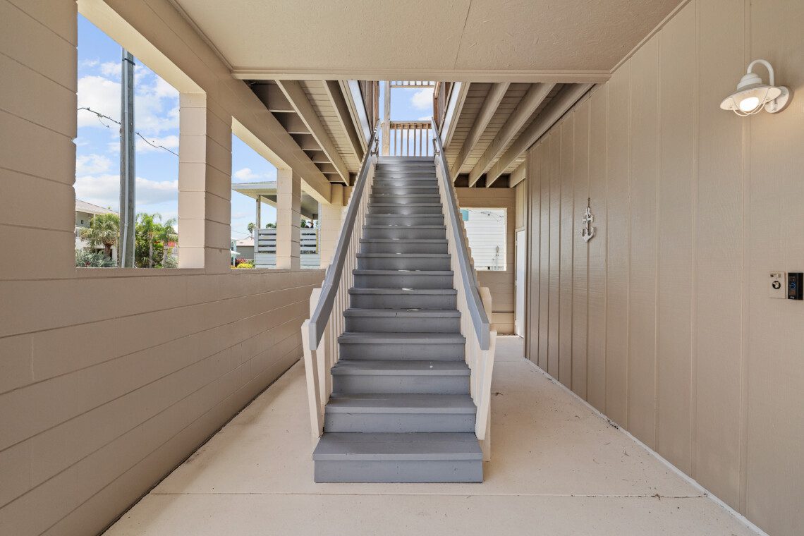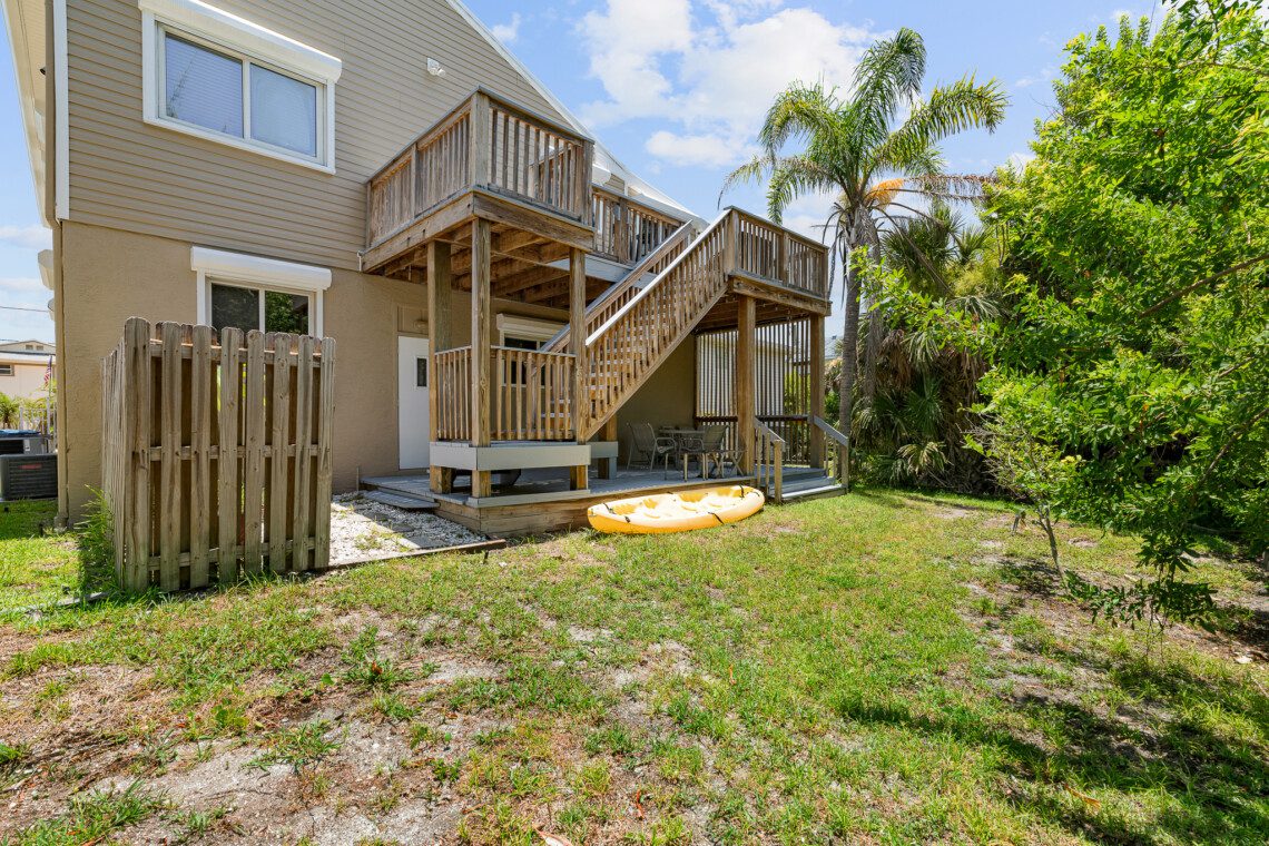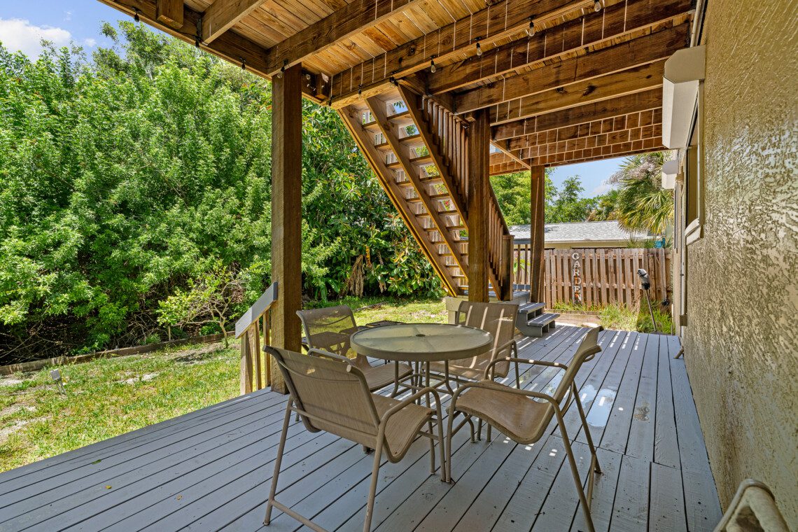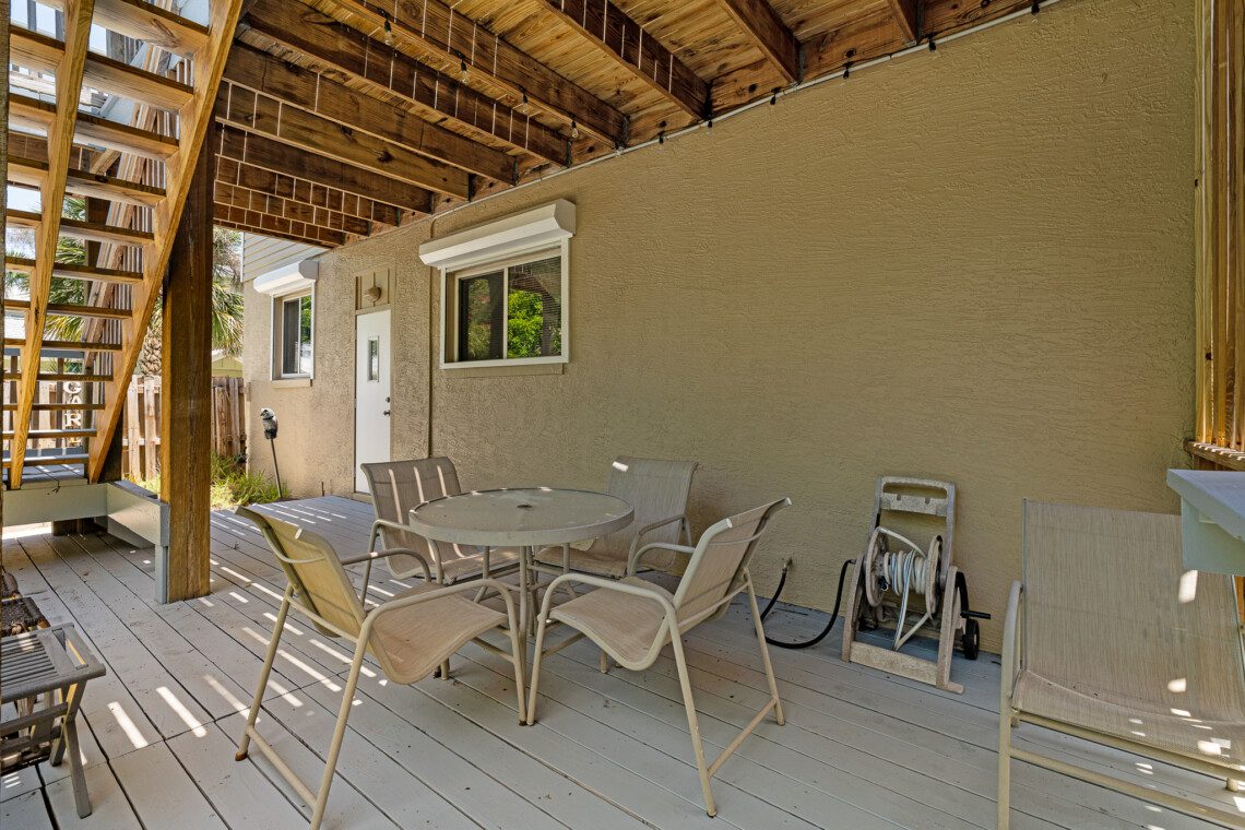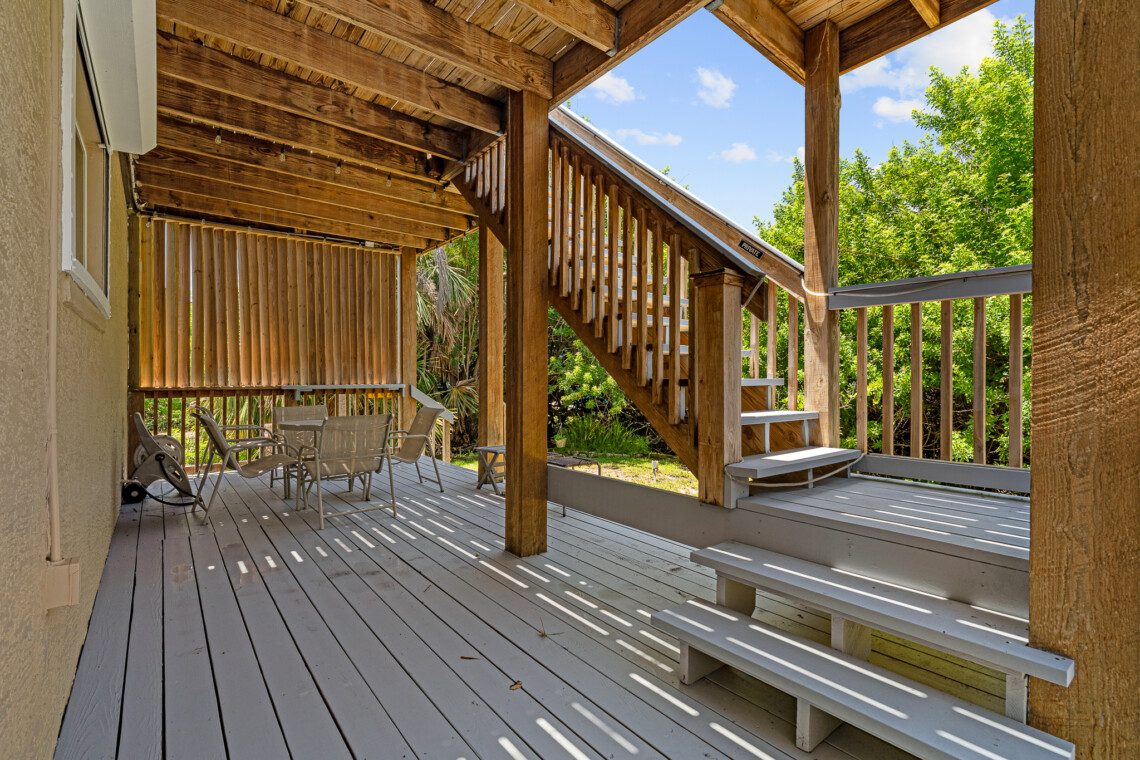 Just off the kitchen, step outside to your private second-floor balcony, which doubles as the rear outdoor space—a spacious wood deck perfect for outdoor relaxation or entertaining. Enjoy cozy evenings gathered around the glass bead firepit, listen to the ocean breeze, and take in the laid-back coastal vibe. It’s a peaceful and private space for morning coffee or stargazing at night.