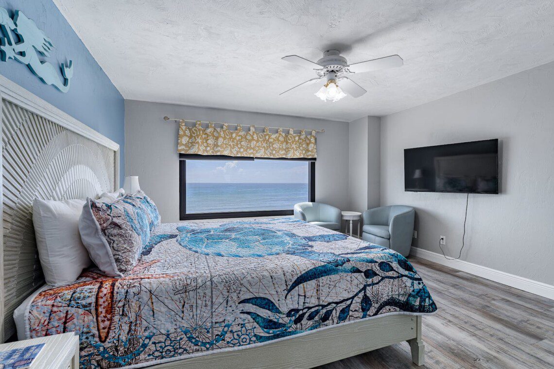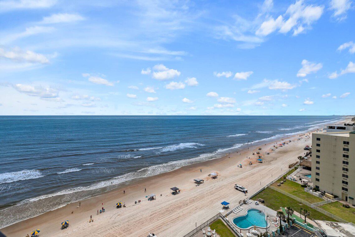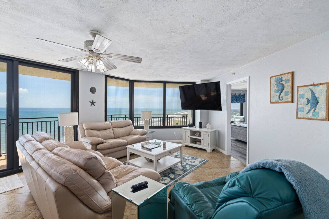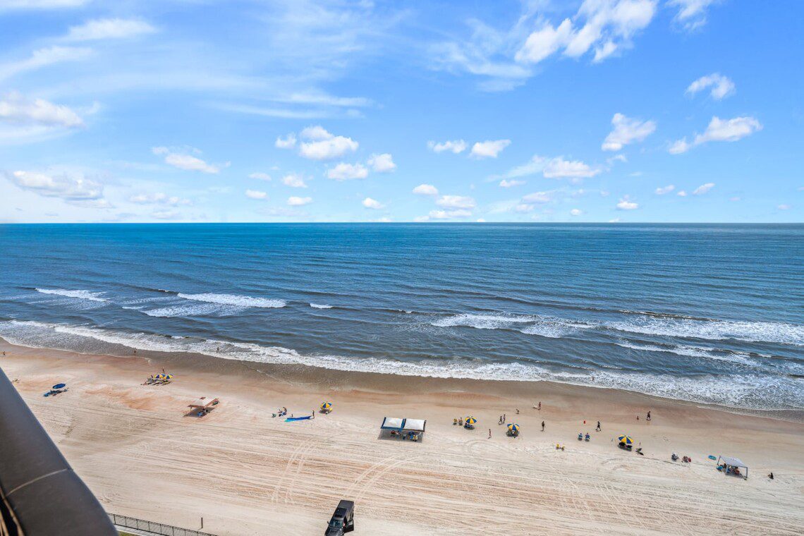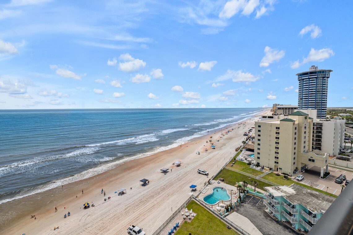 Stay in this updated 3BR/3BA ocean-view condo on the 14th floor in Daytona Beach Shores. Enjoy panoramic ocean views, direct beach access, a heated pool, spa, saunas, library, and nearby restaurants, shops, and Daytona International Speedway.