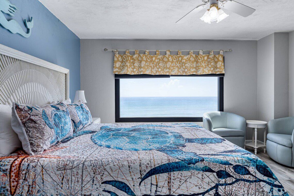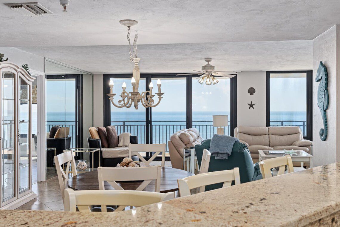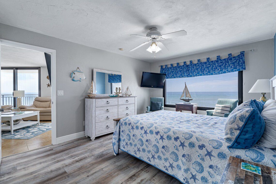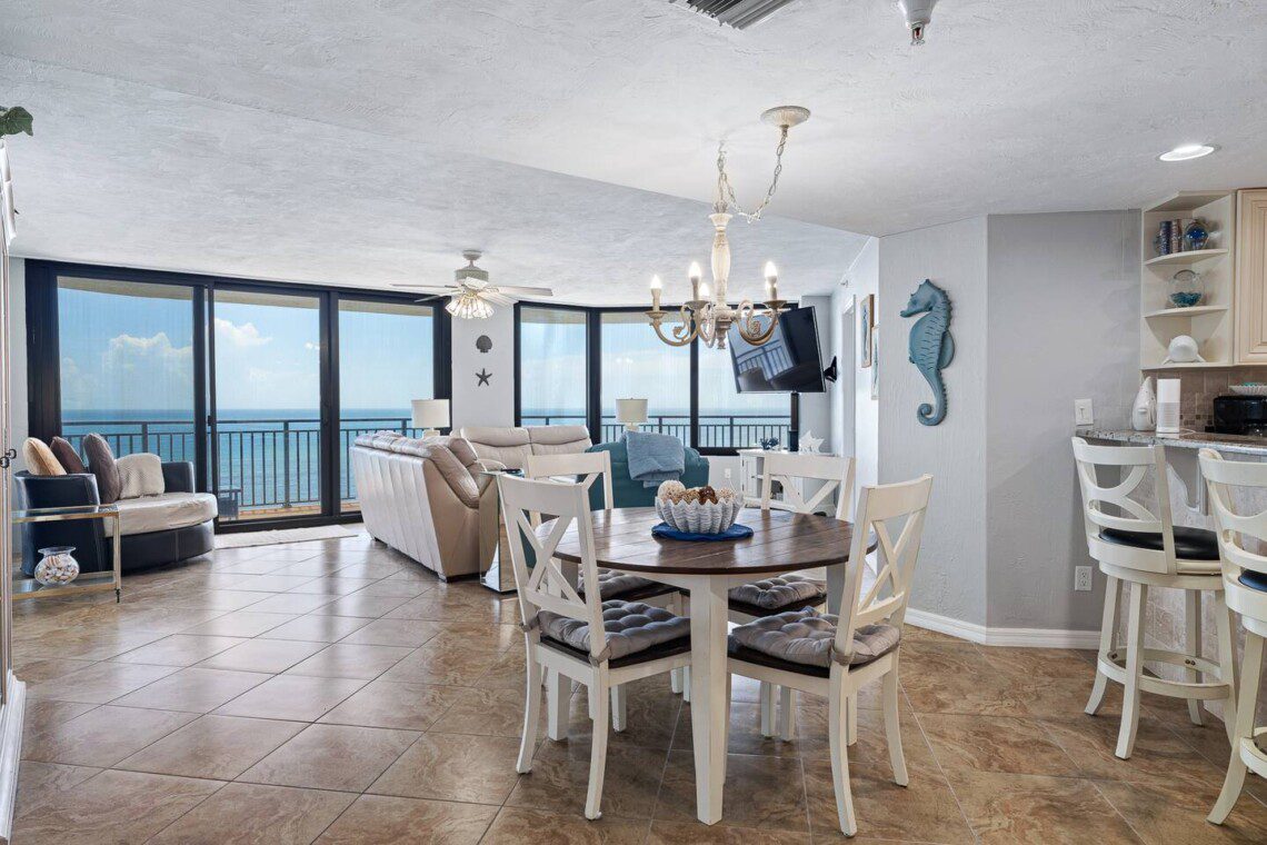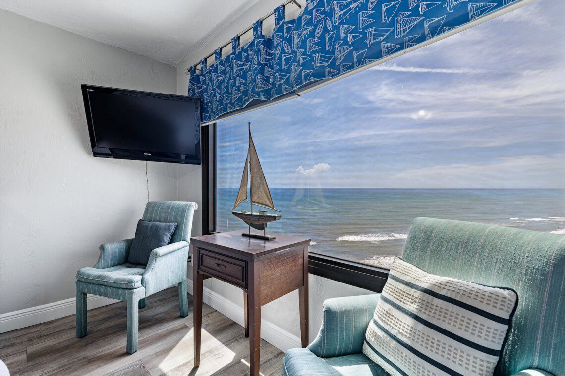 Stay in this updated 3BR/3BA ocean-view condo on the 14th floor in Daytona Beach Shores. Enjoy panoramic ocean views, direct beach access, a heated pool, spa, saunas, library, and nearby restaurants, shops, and Daytona International Speedway.