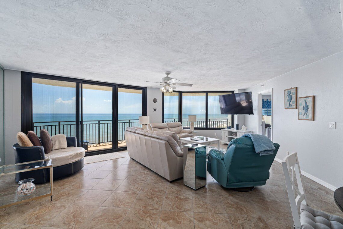 Stay in this beautifully updated 3BR/3BA ocean-view condo on the 14th floor in the desirable Daytona Beach Shores area. Located in a beachfront building with a grand atrium, heated pool, hot tub, spa, saunas, and a library, this condo offers both comfort and luxury. Enjoy sweeping panoramic ocean views and direct beach access. Explore nearby restaurants, shops, and attractions, including the Daytona International Speedway, making it the perfect coastal getaway for families or friends.
